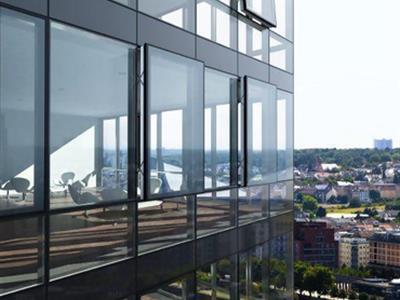 Die Tragprofile dieser wärmegedämmten Pfosten-Riegel-Konstruktion vermitteln eine schlanke Stahlbauoptik. Das gilt für großflächige Profilfassaden ebenso wie für Foyer- und Eingangsbereiche.